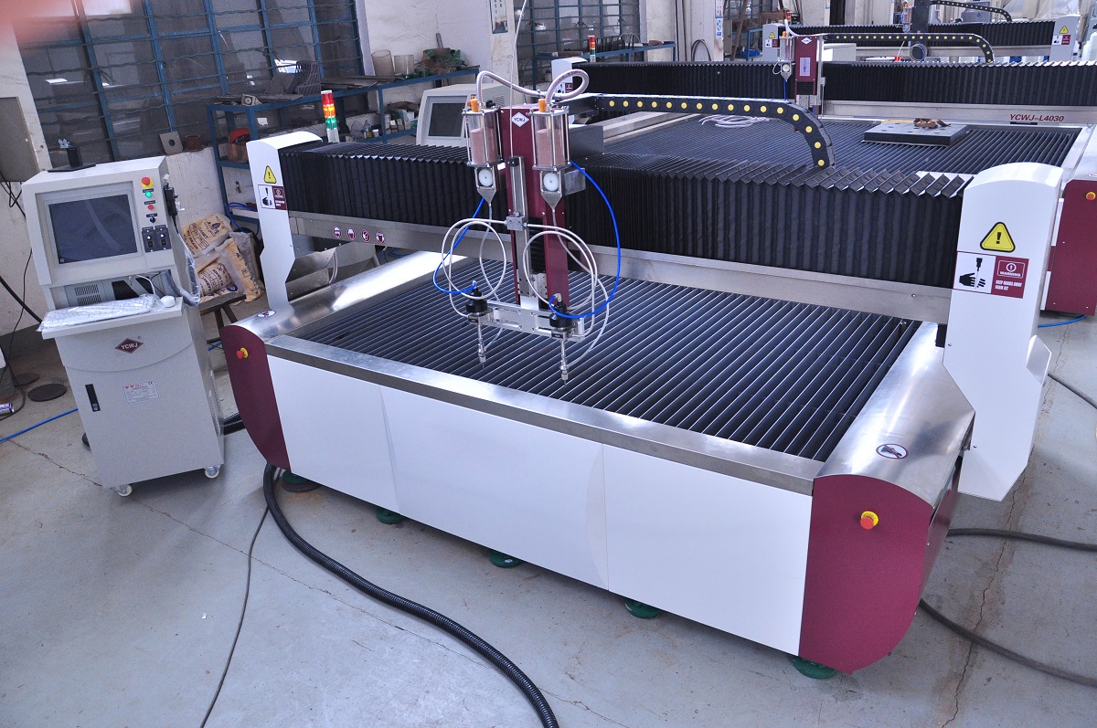This waterjet cutter is mainly composed of ultra high pressure generator, CNC system, cutting platform, switch and high pressure water cutting head, high-pressure pipeline, automatic for the sand etc.
